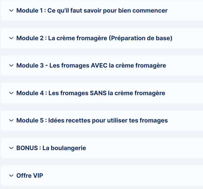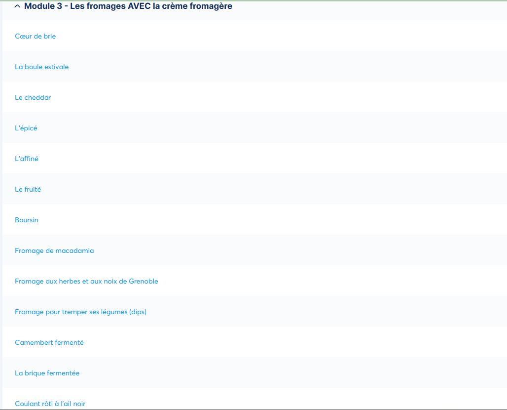 Chaque module s’ouvre sur un menu déroulant avec plusieurs fiches. Par exemple, voici le détail du Module 3